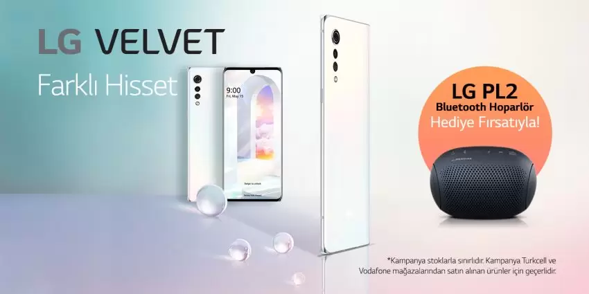 Kıvrımlı köşeleri, şık ve zarif hatlarıyla öne çıkan LG VELVET, hediyesiyle birlikte geldi. 18 Eylül 2020 itibariyle Turkcell ve Vodafone mağazalarında satışa çıktı. Sınırlı sayıdaki LG XBOOMGo PL2 Bluetooth Speaker ve Aksesuar Paketi kazandırıyor. 31 Ekim 2020 tarihine kadar Turkcell ve Vodafone mağazalarından LG VELVET satın alan kullanıcılara sınırlı sayıdaki, LG’nin her an kaliteli müzik dinlemek isteyenler için sunduğu LG XBOOMGo PL2 taşınabilir Bluetooth hoparlör ve Aksesuar Paketi hediye ediliyor. Tüketiciler kampanya ile ilgili detaylı bilgiye www.lgkampanya.com sitesindeki Velvet Kampanya sayfasından sayfasında ulaşabiliyorlar.